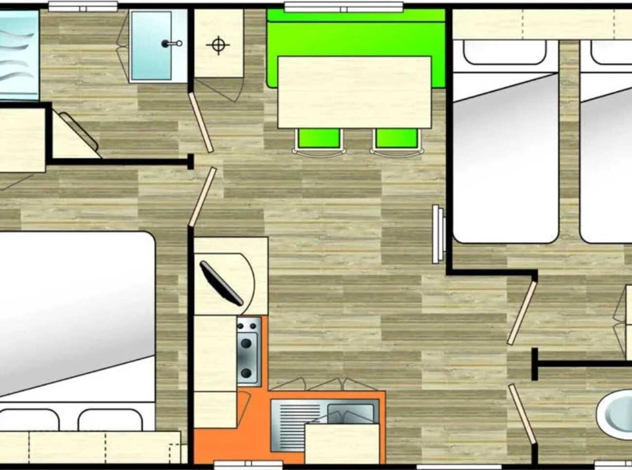 Mobile Home 2 Chambres. This mobile home includes 2 bedrooms, kitchen, a terrace and 1 bathroom with a shower. The mobile homes kitchen, which has kitchenware, is available for cooking and storing food. This mobile home offers a private entrance and a TV. The unit has 3 beds. ;
